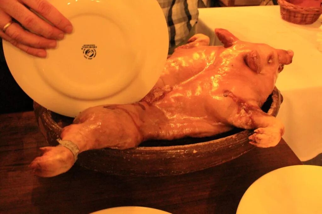 其中烤乳猪就是赫赫有名的。西班牙厨师与中国厨师用刀片肉不同,他们用盘子来片,这样更加体现出乳猪的外皮酥脆、肉质的鲜嫩。