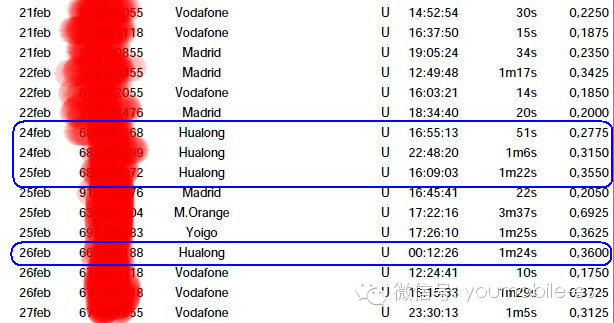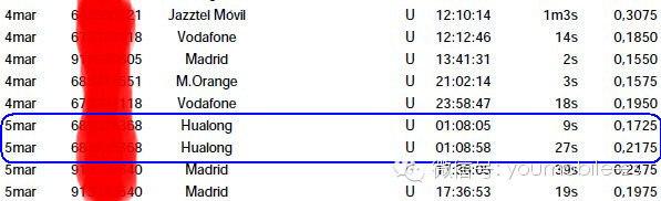 如正信话费账单显示,友谊通信号码(在此显示为友谊通信所属集团名称Hualong)并不在M.Orange类即不属于llamadas móviles Orange免费类。