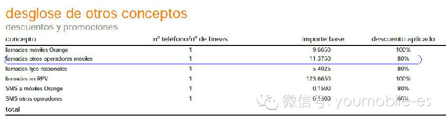 正信联通话费单中有折扣一栏,即desglose de otros conceptos/ descuentos y promociones, 显示拨打其他公司电话号码即otros operadores móviles有80%折扣,但是并不是免费。